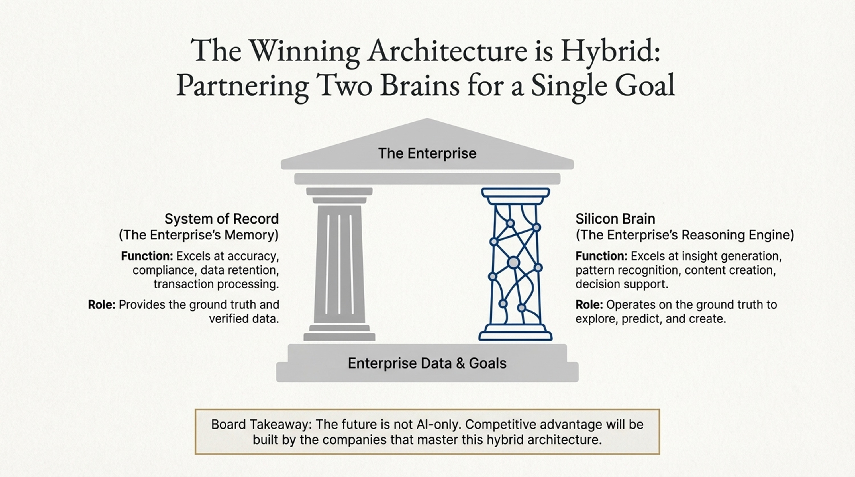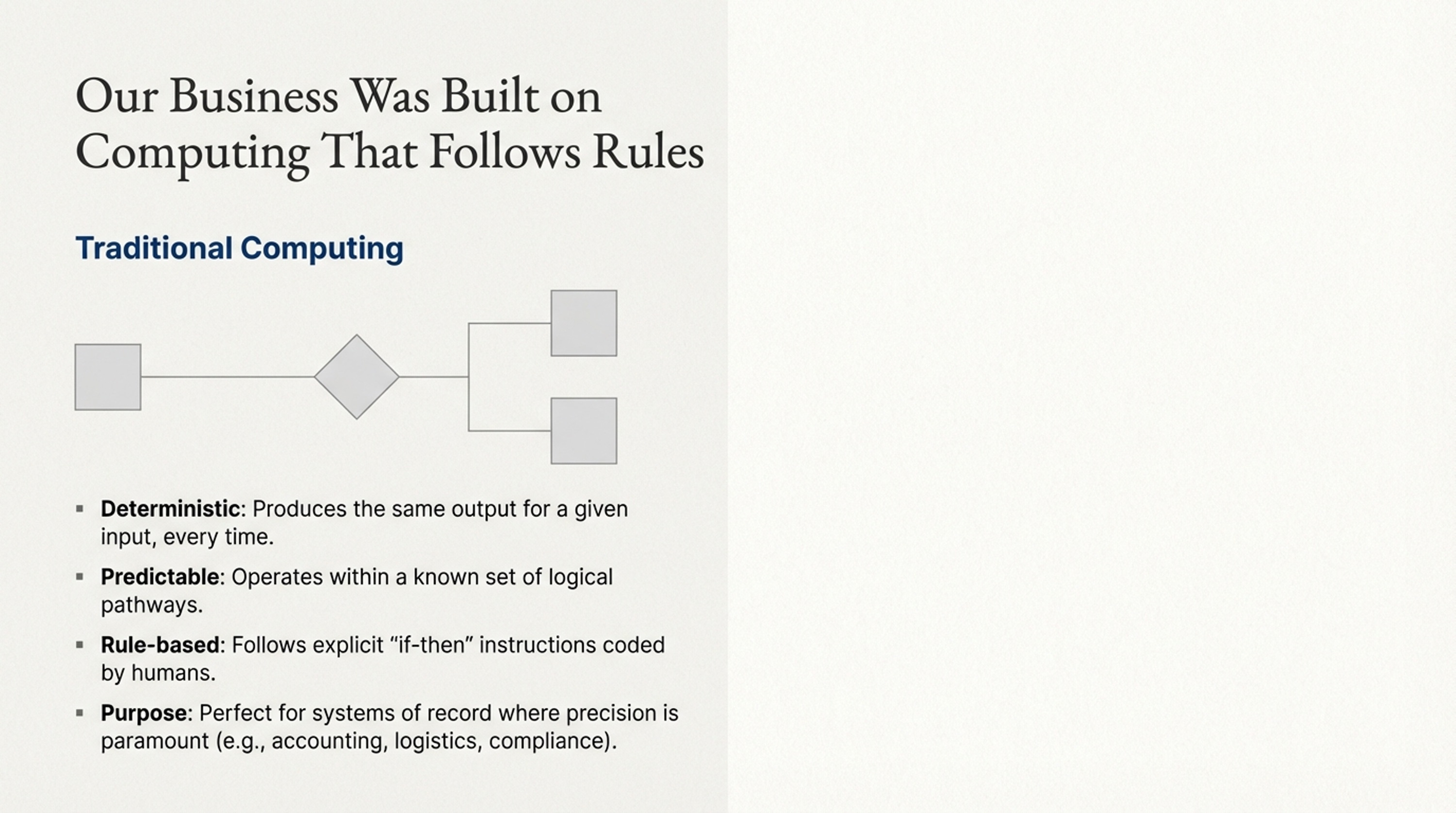 • Visuals: Use clean, corporate imagery. Contrast “rigid/structured” images for Traditional Computing with “organic/fluid” images for AI.