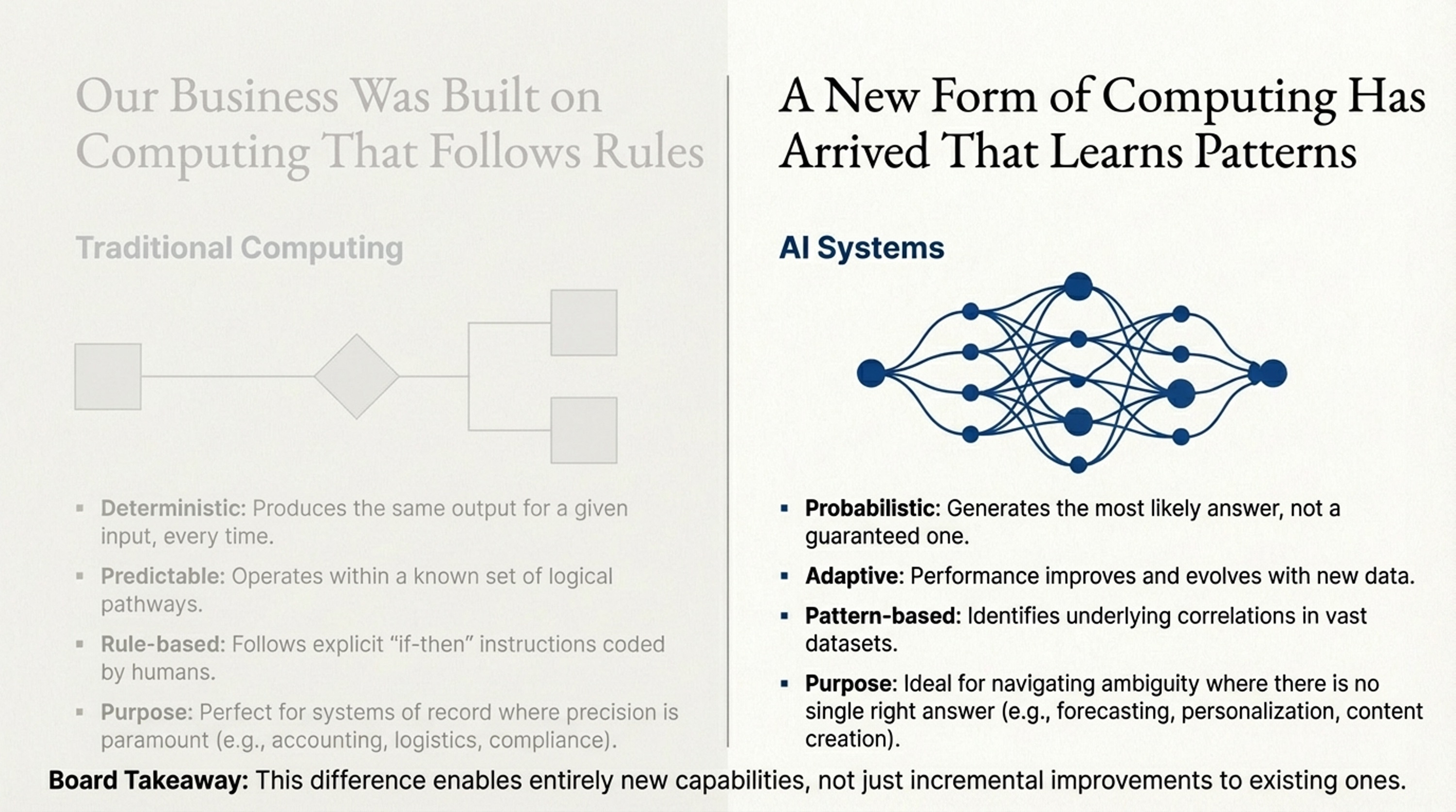 Goal: Explain why AI represents a fundamental shift in computing—from “following rules” to “learning patterns”—and how this impacts business strategy.