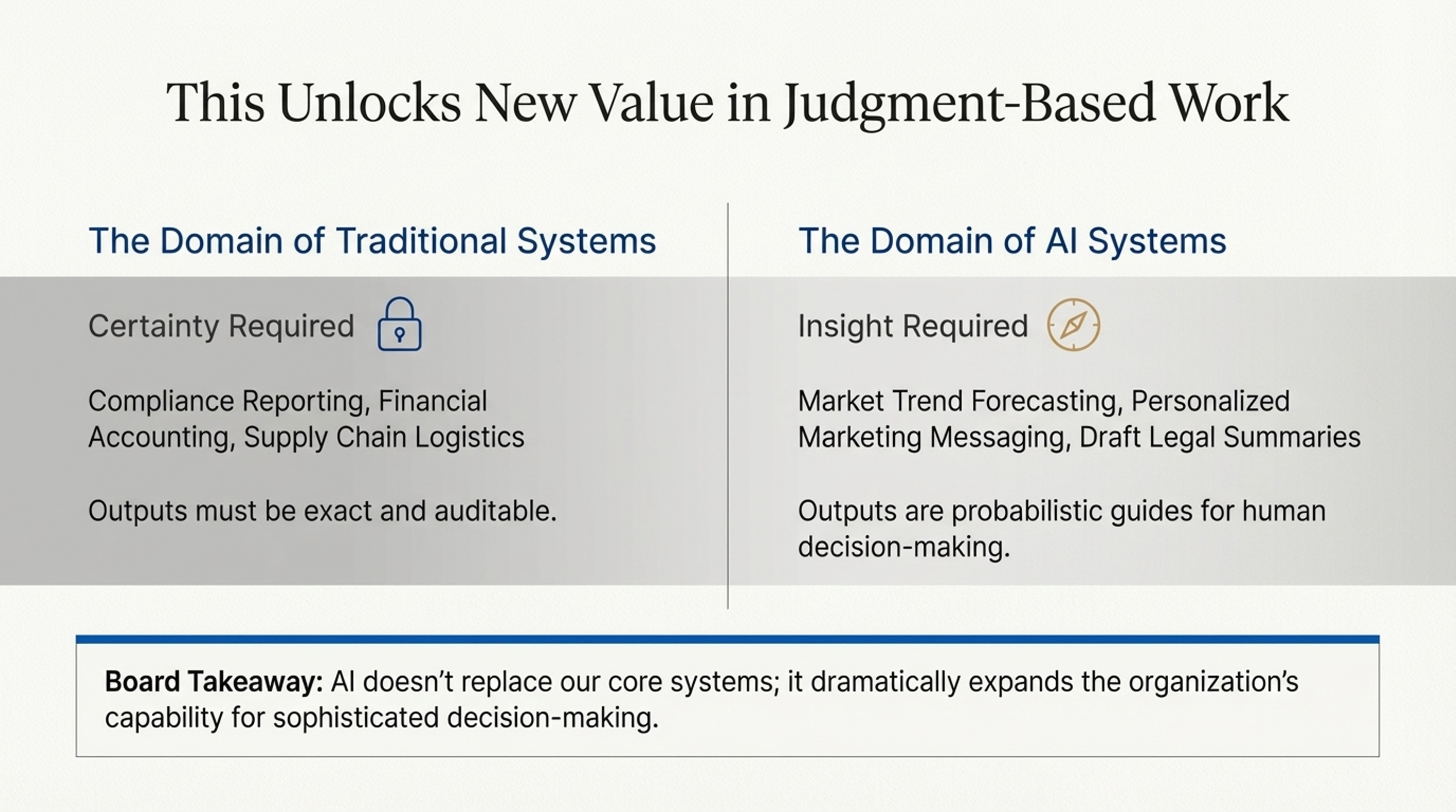6. Business Implication 1: AI offers Insight (Prediction), while traditional software offers Certainty (Calculation).