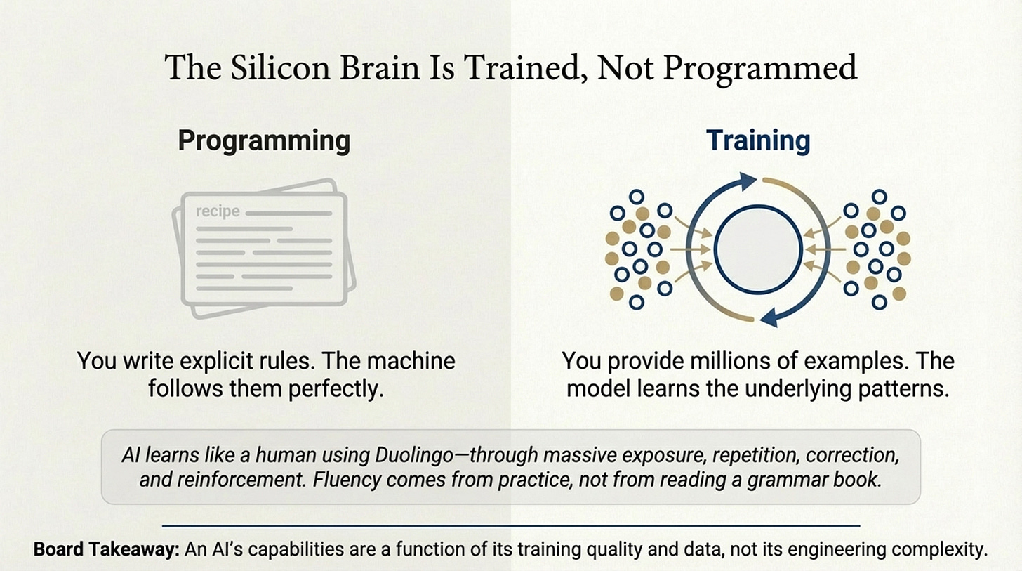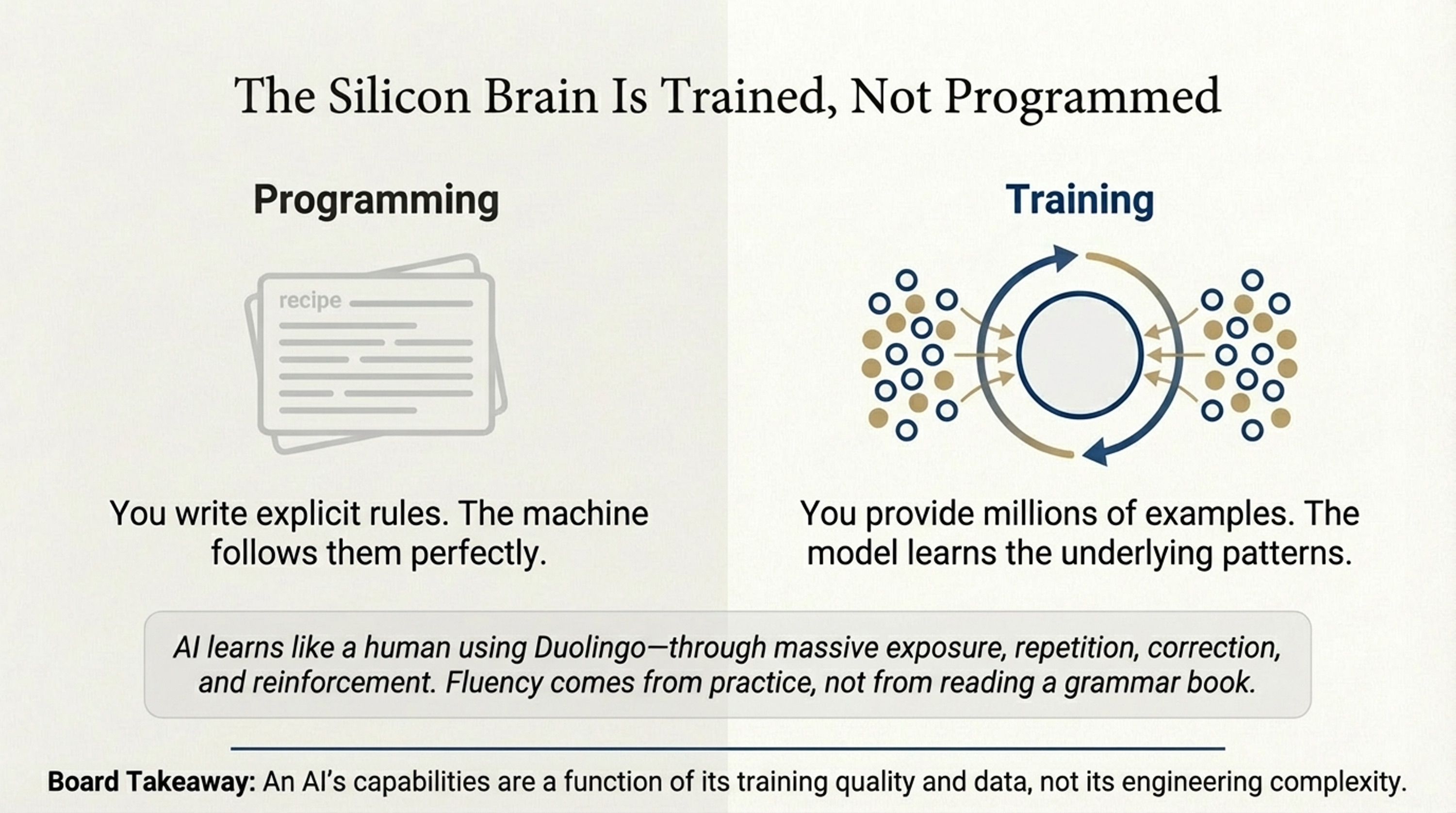 4. Programming vs. Training: The “Duolingo” analogy (Learning patterns vs. memorizing rules).